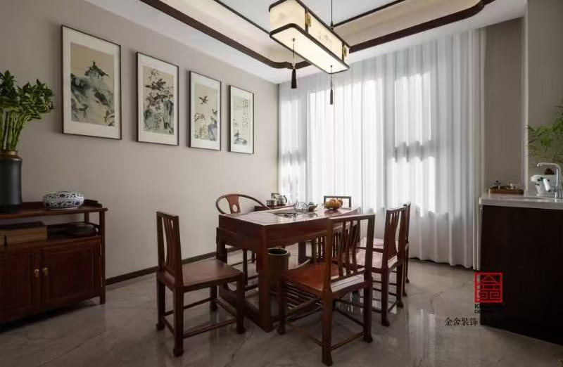原木與傳統(tǒng)花格裝飾,盡顯中式風情??臻g布局巧妙,功能區(qū)互不干擾,動靜分離。錯層高差處,兼具實用與美觀。