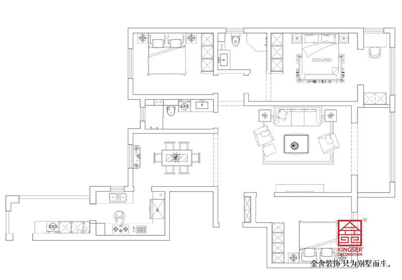 2、臥室進(jìn)衛(wèi)生間需要穿過餐廳或客廳;臥室作為休息區(qū)域,門朝向客廳或餐廳時(shí),私密性一般;