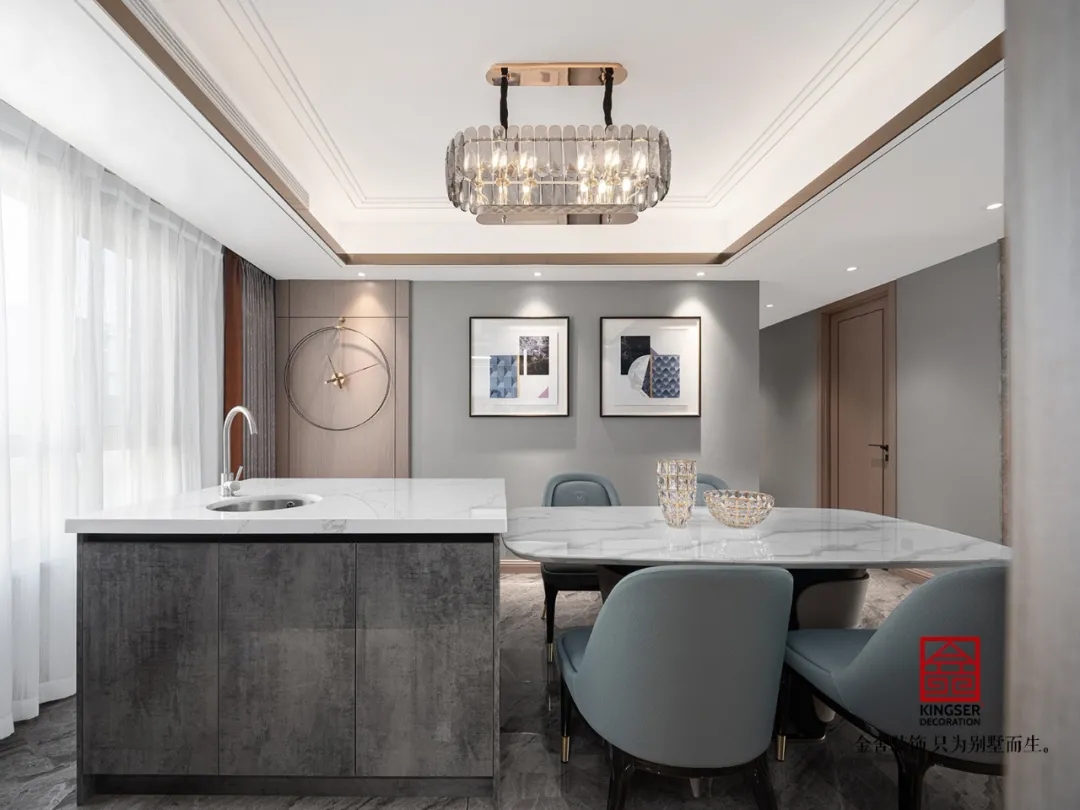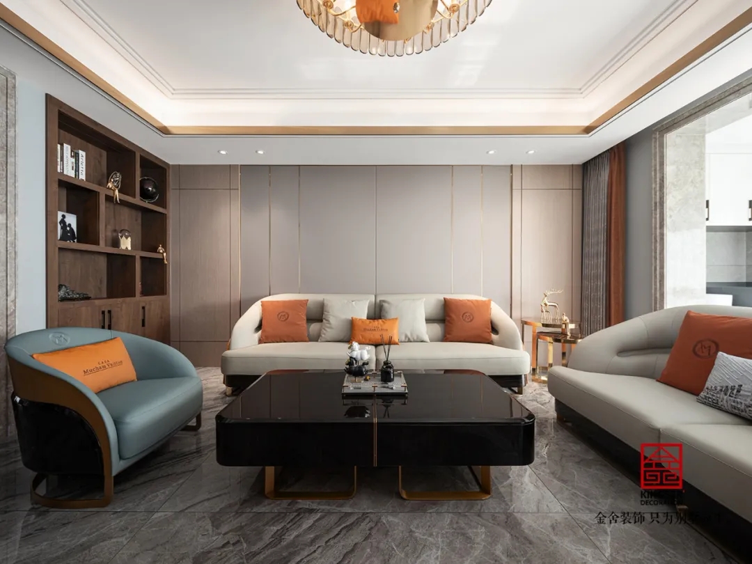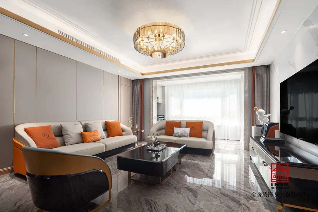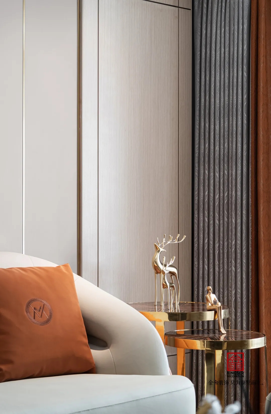 此案例為石家莊金舍裝飾-東南智匯城191平米輕奢風(fēng)格裝修實(shí)景?;疑珜?kù)o似夜,橙色活力迷人,優(yōu)雅低調(diào)的灰色,給人以夜的寧?kù)o,是包羅萬(wàn)象的,可以與任何顏色協(xié)調(diào)。橙色恰如冬日里的陽(yáng)光,可以是快樂愉悅的,又透出一絲深秋的憂傷。