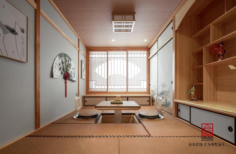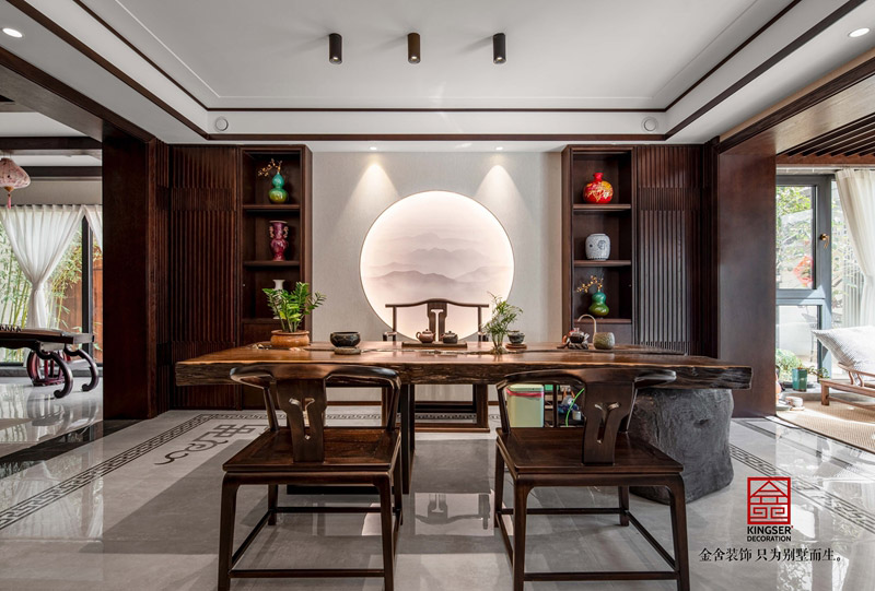 “茗香縈繞群賢來,流觴曲水落花去。”中式的茶室并沒有破壞整體的協(xié)調(diào)感,中式茶臺(tái),半圍合的琴室,和極具中國風(fēng)味的庭院,都在一定程度上凸顯出新中式的韻味,古典而優(yōu)雅。