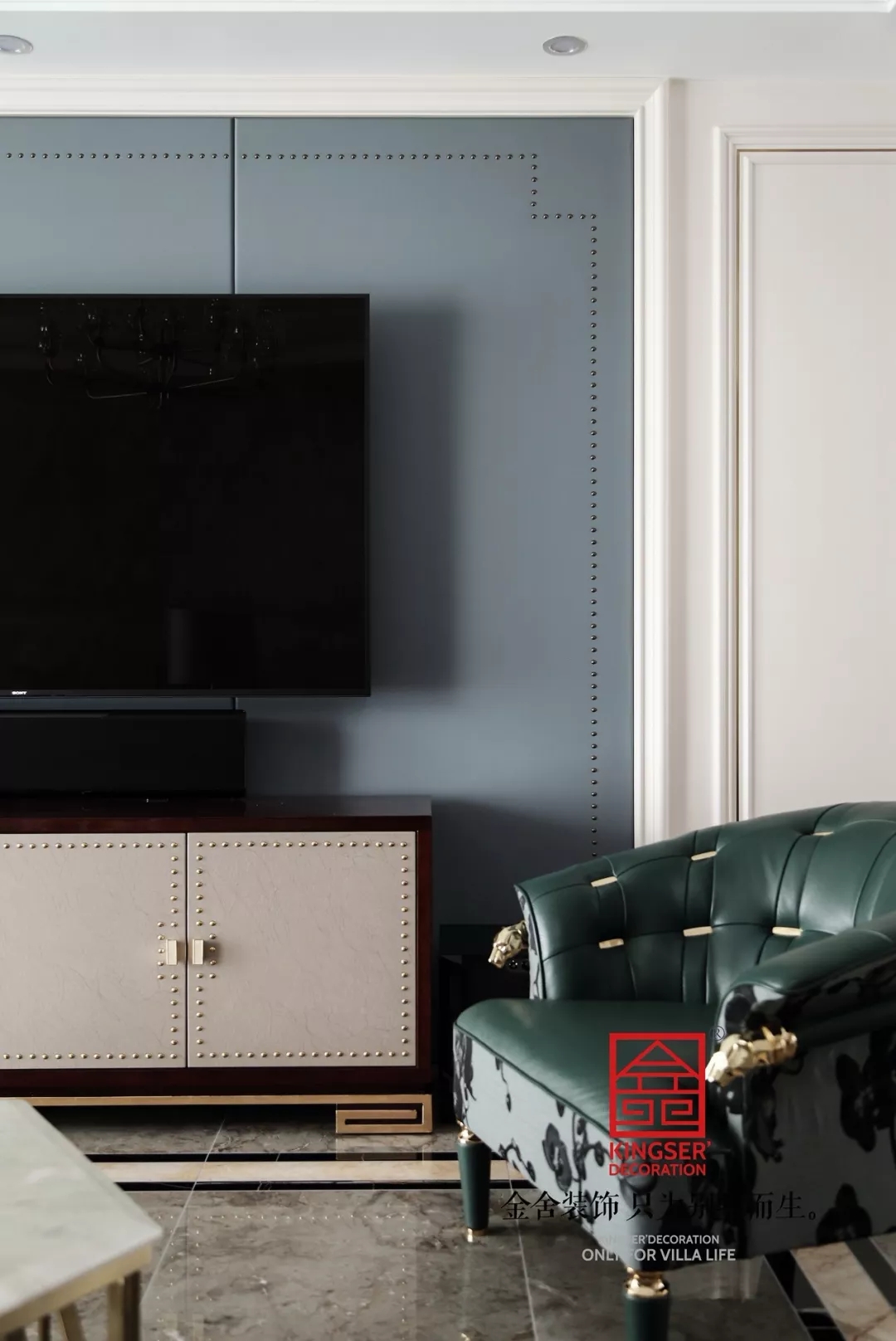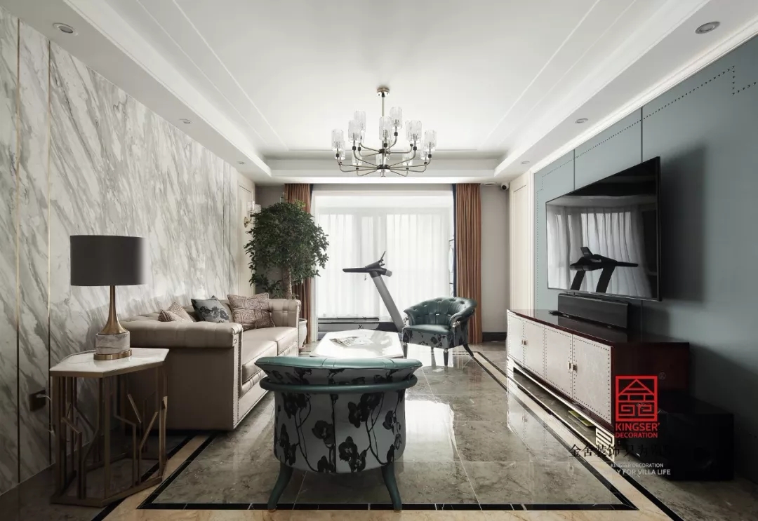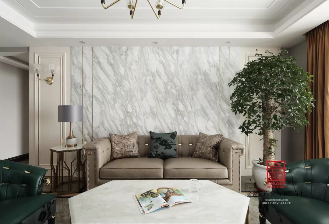 立于紛擾的世界,人們馬不停蹄的尋找獨(dú)屬自我的生活方式,空間成為了投射自我的一面鏡子??蛷d中的事物就是一個個滿足生活需要的元素,因?yàn)橛兴麄兇嬖谖覀儾庞鞋F(xiàn)在的生活,一深一淺一素一濃的沙發(fā)在陽光下奕然生輝,融合多色調(diào)的綠色夾雜著自然紋路大理石,為整個空間創(chuàng)造出一種自然風(fēng)十足的環(huán)境。