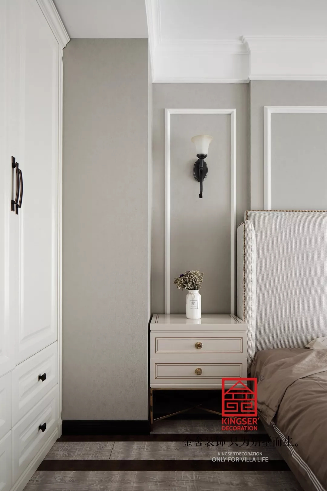 整個臥室為灰色基調(diào)的細(xì)節(jié)里加入鮮活的軟裝布藝,在端莊沉穩(wěn)的空間里,點(diǎn)亮了溫馨的氣息,細(xì)膩綿軟的感覺瞬間在空間中炸裂,讓處在空間中的人都能體會到臥室給予使用者的無限舒適。