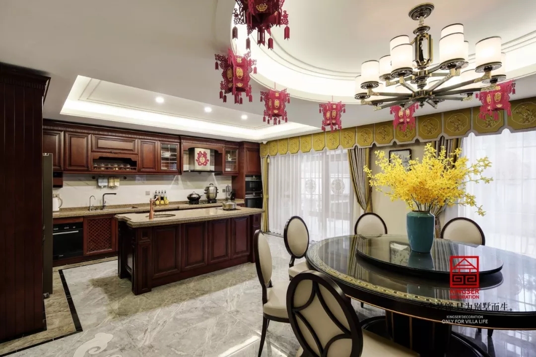 開放式廚房緊挨著以圓桌為主體的餐廳,中國人的傳統(tǒng)就是追求和和美美,用圓形的餐桌象征著團圓與和美。廚房的整體風(fēng)格還是注重中式風(fēng)格的廚房,只用中間出現(xiàn)的島臺才體現(xiàn)細(xì)節(jié)的差異。