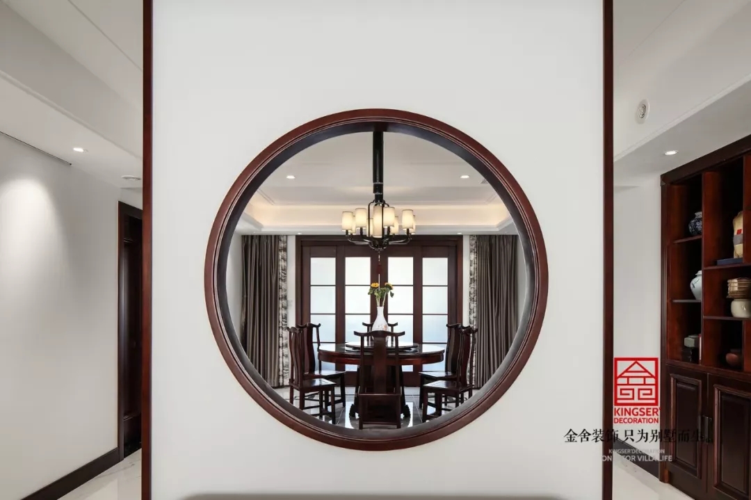 圓形框景手法借此框得景,既保留傳統(tǒng)的味道,又將古代園林構(gòu)景手法融入其中,讓傳統(tǒng)元素在現(xiàn)代背景下的演繹,整個(gè)空間氛圍典雅而不乏時(shí)尚,體現(xiàn)出現(xiàn)代人對(duì)高雅居住環(huán)境的追求。