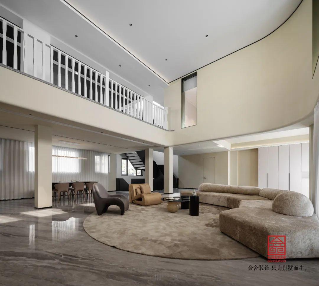 巨大的挑空空間之下,是設計師對于設計的把控,首層6米挑空客廳以鋼化玻璃幕墻打造通透感,雙層中空玻璃引入充沛自然光,半開放的廚房、島臺吧臺與落地窗景融為一體。全屋采用暖白、卡其、米咖等低飽和色調(diào),墻面啞光質(zhì)感涂料與淺咖沙發(fā)碰撞,塑造出極具質(zhì)感的空間。