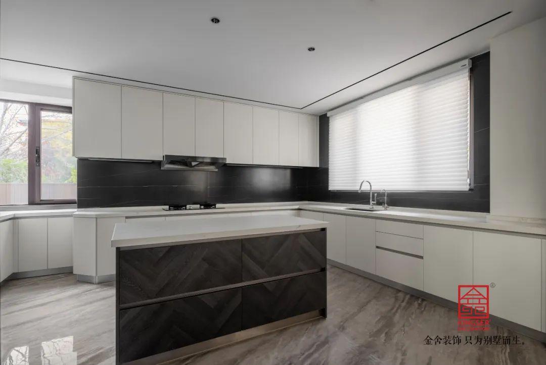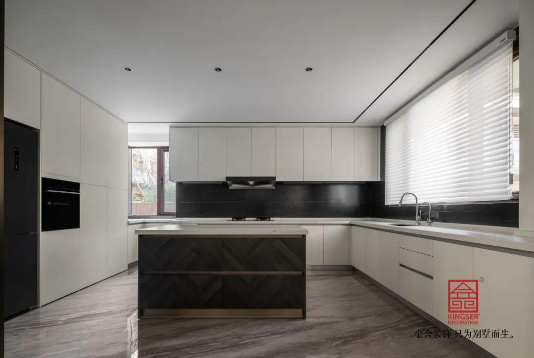 黑白配色的半開敞式廚房,中導臺也置入其中,經(jīng)典的配色隨時都不會讓人感覺到厭煩,巡回式動線合理且流暢。