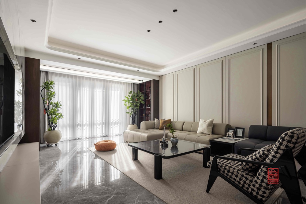 褪去城市繁冗華麗的外殼,回歸至與人的內(nèi)在共鳴,斑駁的光影在客廳空間徜徉,大理石與墻板的搭配,釋放出一種優(yōu)雅、沉靜及治愈的氛圍感,貫穿于整個(gè)別墅裝修空間的動(dòng)線。