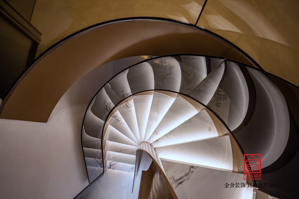 螺旋線條復(fù)刻鸚鵡螺自然韻律,金屬扶手勾勒利落光影,石材踏板沉淀溫潤(rùn)質(zhì)感。剛?cè)崤鲎查g,讓樓梯不止是通行空間,更成為家居里自帶焦點(diǎn)的藝術(shù)裝置。