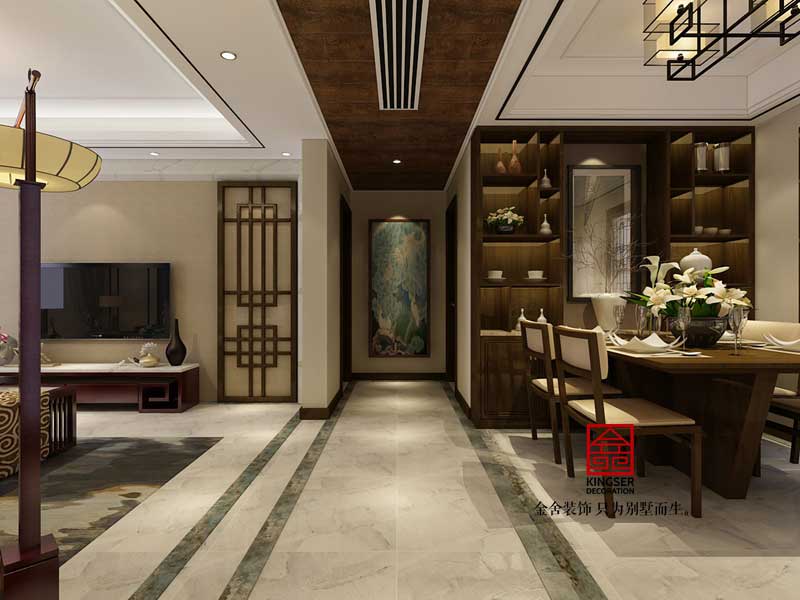在整體風(fēng)格的特征上,多采用簡潔硬朗的直線條,簡約而又不失穩(wěn)重,餐廳墻邊上高大的博古架搭配屏風(fēng)樣式的廚房推拉門,和客廳電視背景墻既融合又統(tǒng)一,搭配同樣厚重的實(shí)木桌椅沙發(fā),與吊頂造型相呼應(yīng),不僅反映出現(xiàn)代人追求簡單生活的居住要求,更迎合了中式家具追求內(nèi)斂、質(zhì)樸的設(shè)計(jì)風(fēng)格,更能展現(xiàn)出與眾不同的一面。
