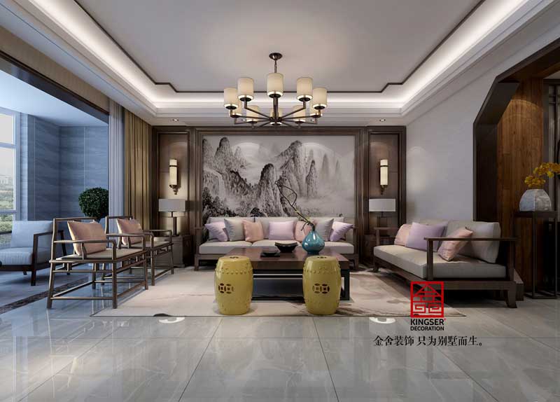 本套案例在設(shè)計(jì)時(shí)摒棄了傳統(tǒng)中式的雕梁畫棟。運(yùn)用線條勾勒出空間層次感,沙發(fā)墻面運(yùn)用簡(jiǎn)單的花格配上山水壁畫,與紅木家具形成呼應(yīng),彰顯中式的大氣之美