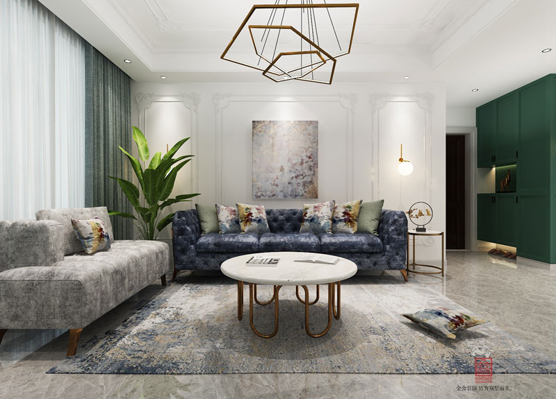 本案為東南智匯城153平米三室兩廳兩衛(wèi)效果圖。業(yè)主為三口之家,女主人為烘焙愛好者,喜歡紅酒、甜點(diǎn)、咖啡,男孩雖然上小學(xué),卻已是小小男子漢,對黑白灰有著獨(dú)有的熱愛。石家莊金舍裝飾設(shè)計(jì)本案公共空間風(fēng)格定位為輕美式,以白色為主要基調(diào)與柔和的空氣灰自然過渡,點(diǎn)綴孔雀綠,使整個(gè)空間活潑有生氣。公共空間減少了硬裝造型,劃分了大量的公共儲物空間,避免空間雜亂。兒童房與次臥是小男孩鐘愛的黑白灰格調(diào)的臥室,黑白結(jié)合的木作搭配橙色的點(diǎn)綴,成熟中不乏童趣。