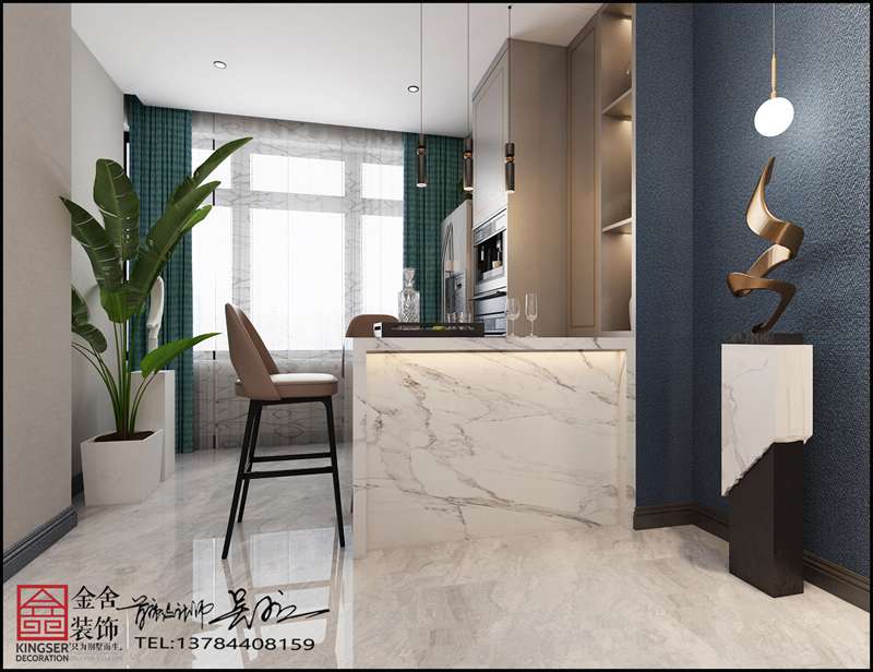 本方案設計的最大亮點在于餐廳和西廚銜接的吧臺位置,把北陽臺和餐廳打通,顯得空間感十足,視覺上通透,在生活中實用性更強。