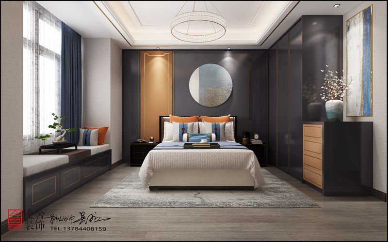 設計方案中輕奢新中式風格臥室的色彩設計受現(xiàn)代繪畫流派思潮影響很大。通過強調(diào)原色之間的對比協(xié)調(diào)來追求一種具有普遍意義的永恒。