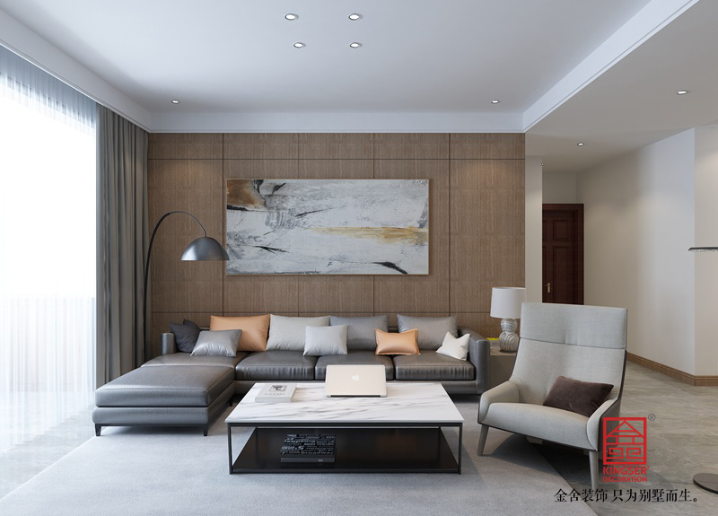 舒適的皮質(zhì)沙發(fā)、精簡的四角茶幾、寬敞的電視屏幕,層疊的輕盈呼之欲出,傳遞著寫意浪漫的生活美,仿佛能在夜霧或晨霜中,聽到客廳清淺的呼吸。軟裝,讓空間更加富有情調(diào)。