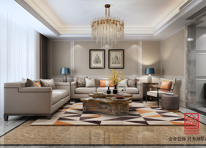 藍、黃是梵高最愛用到的色彩,我們把它融入公共區(qū)域。黃色絨布抱枕、窗簾明度最高,令人感到溫暖和愉悅,相對的臺燈就選擇了藍色,中和掉明黃的跳躍,給人以安靜、舒適的氛圍。燈管、茶幾、飾品等少量鉻金屬和黃銅色的點綴,隱隱透露著低調(diào)的奢華感,不同材質(zhì)的黃色給予了環(huán)境多層次碰撞的可能性。