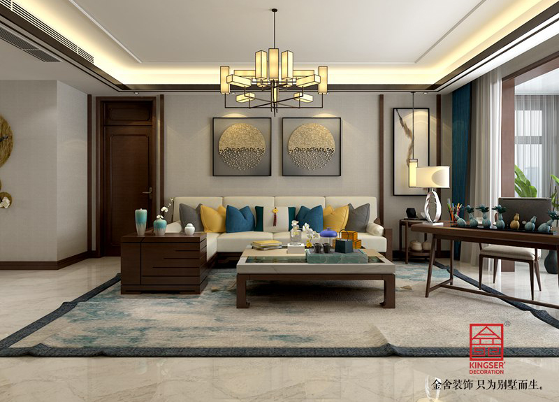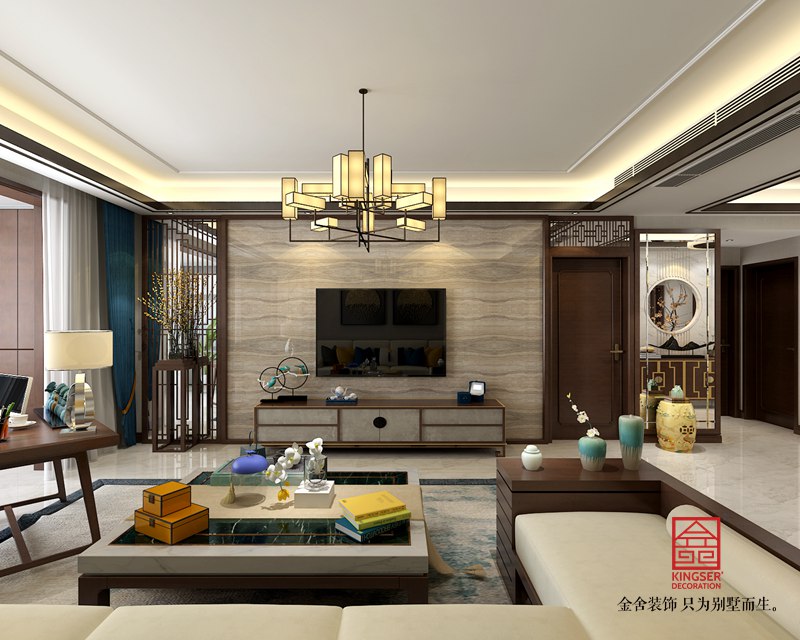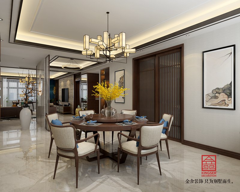 本案為石家莊金舍裝飾-御河上院176平米新中式風格裝修效果圖。位于河北石家莊正定新區(qū)的一套大平層豪宅度假房。根據項目的特點,設計師在設計風格定位時采用現代中式風格,通過合理的空間規(guī)劃,材質與色彩的精心拿捏,營造出一處富有尊貴感和人文特色的中國式家居空間。