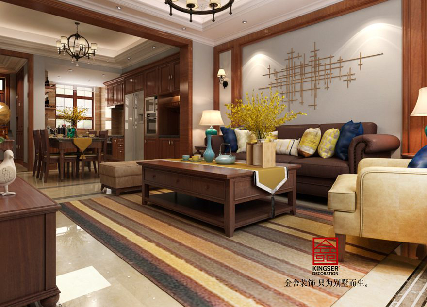 設(shè)計說明:此案例為石家莊金舍裝飾-西山林語190平米美式風格裝修效果圖 。一個幸福的5口之家,年輕小夫妻帶著可愛的寶寶和父母一起生活。他們最求生活品質(zhì),喜歡自由,優(yōu)雅,自然閑適的居住環(huán)境??蛷d空間憑棄過多的繁復(fù)裝飾,用簡潔的設(shè)計手筆和創(chuàng)新的搭配,著重與材質(zhì),色調(diào)與空間的對話。地面采用仿石材拋45度柔光磚營造溫馨自然的感覺,讓整個空間在不經(jīng)意間流露出高壓的格調(diào)。敞開式的廚房將中西廚及餐廳融合在一起,使得整個空間的采光得到改善,同事也大大的增加了餐廳的空間視覺。