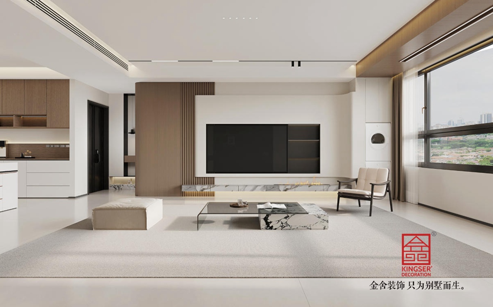 空間布局上,采用開放式設計,讓客廳與周邊區(qū)域自然銜接,增強了空間的通透感與互動性。大面積的落地窗是設計亮點,引入充足自然光線,同時將城市景觀納入室內,使空間與外界環(huán)境有機融合。
