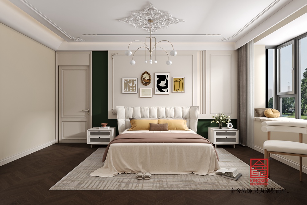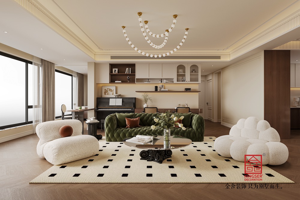 該客廳以中古風(fēng)為設(shè)計(jì)脈絡(luò),巧妙融合復(fù)古與現(xiàn)代元素。整體色調(diào)溫暖柔和,木質(zhì)地板與淺米色墻面相襯,營(yíng)造出靜謐舒適的基底氛圍。 墨綠色絲絨沙發(fā),憑借其復(fù)古的紋理與飽滿的造型,成為空間視覺重心,搭配色彩協(xié)調(diào)的抱枕,盡顯復(fù)古優(yōu)雅。兩側(cè)造型圓潤(rùn)、質(zhì)感柔軟的白色單人椅,為空間注入靈動(dòng)與溫馨感,與沙發(fā)形成有趣的風(fēng)格對(duì)話。