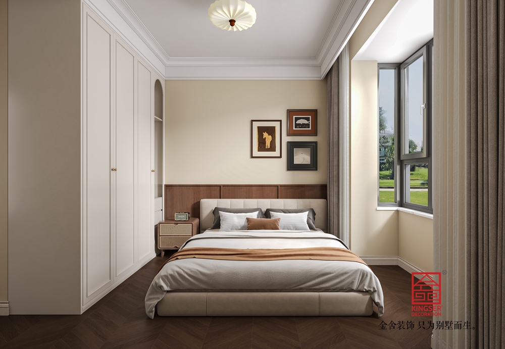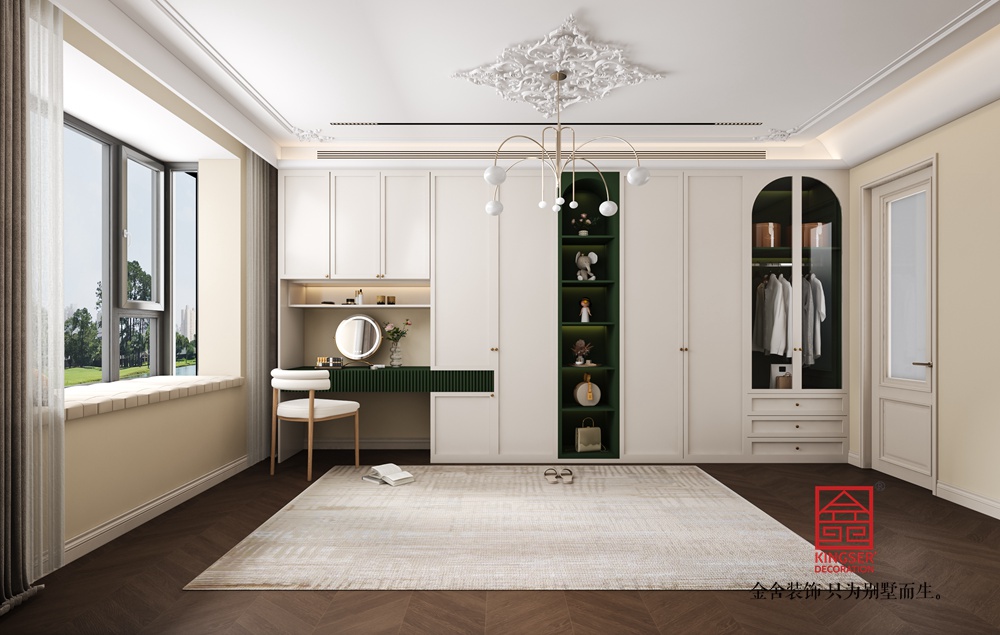 頂部獨(dú)特的串珠吊燈,造型別致,燈光透過珠串散發(fā)柔和光暈,為空間蒙上一層復(fù)古浪漫的濾鏡。背景墻的柜體設(shè)計(jì),兼具收納與展示功能,陳列的物品為空間增添了故事感與文化底蘊(yùn),整體打造出一個(gè)復(fù)古雅致且舒適宜人的中古風(fēng)客廳空間。