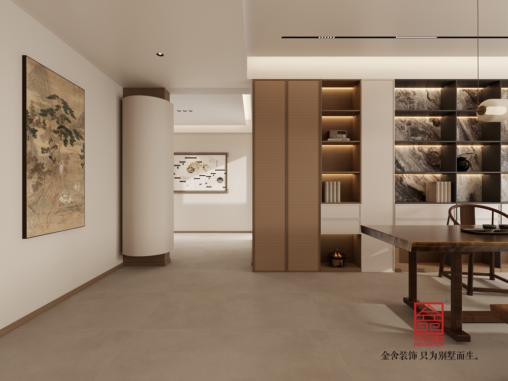 寬闊的落地窗引入充足自然光線,搭配雅致的窗簾,讓室內(nèi)外景致交融??臻g中點(diǎn)綴的綠植、中式擺件,以及墻上的簡約裝飾,都為空間增添了文化氣息與自然意趣,打造出一個兼具實(shí)用性與美學(xué)價值,能讓人在現(xiàn)代生活中感受東方美學(xué)底蘊(yùn)的愜意居所。